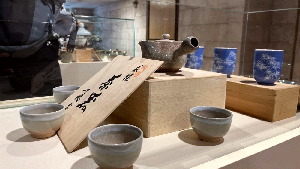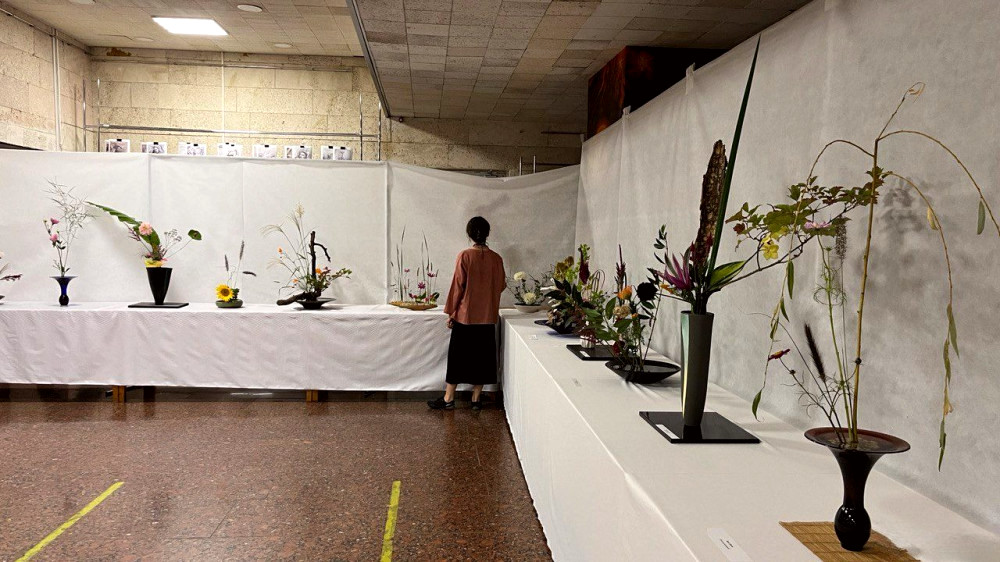 At the KPI library, visitors can view several thematic exhibitions including ikebana, embroidered temari balls, oshibana compositions, kimonos, and Japanese household ceramics, along with sumi-e.