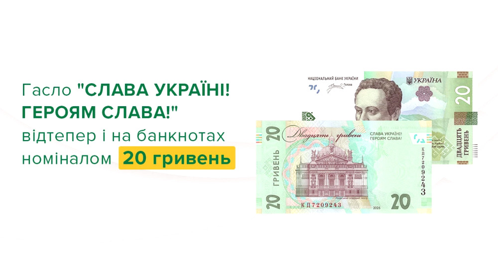 Starting from August 21, the National Bank of Ukraine will issue new 20 hryvnia banknotes. The reverse side of the banknotes will feature the patriotic slogan "Glory to Ukraine! Glory to the Heroes!" in the upper right corner.