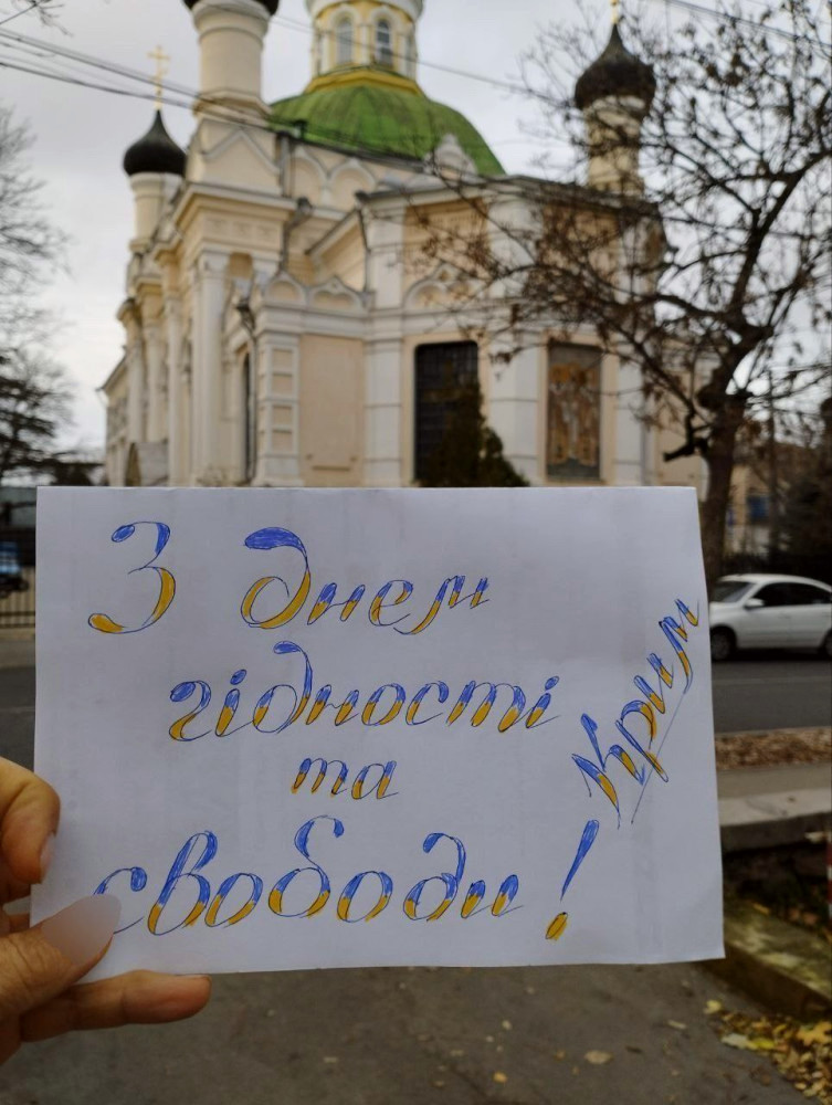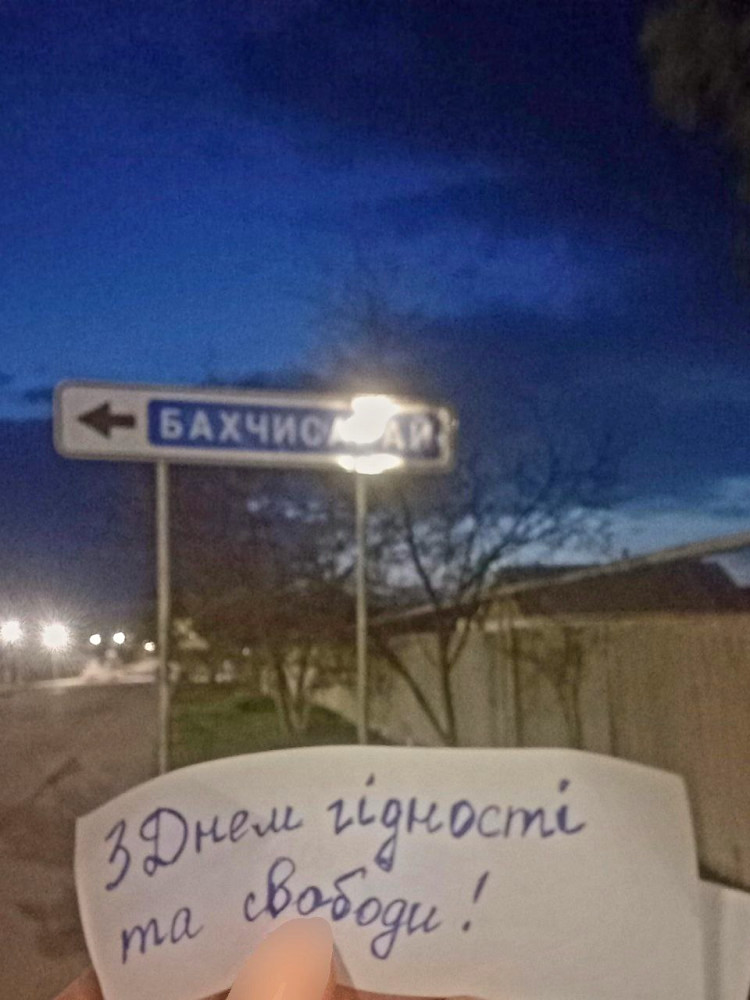 Activists from the resistance movement «Yellow Ribbon» sent their greetings to Ukrainians in honor of the Day of Dignity and Freedom, sharing photos from temporarily occupied cities such as Simferopol, Sevastopol, Bakhchisarai, Donetsk, Melitopol, and Henichesk.