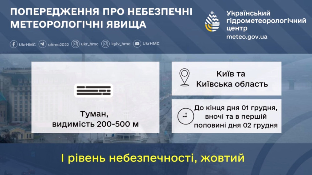 In Kyiv and the surrounding area, fog is anticipated until the end of December 1, as well as overnight and in the morning of December 2, with visibility ranging from 200 to 500 meters. This information is provided by the Ukrainian Hydrometeorological Center via Telegram.