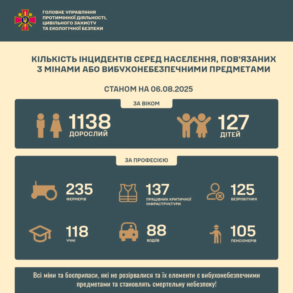 As of August 6, since the beginning of the invasion, 1,265 individuals have suffered due to hostile mines and remnants of war, of which 127 are children and 1,138 are adults.