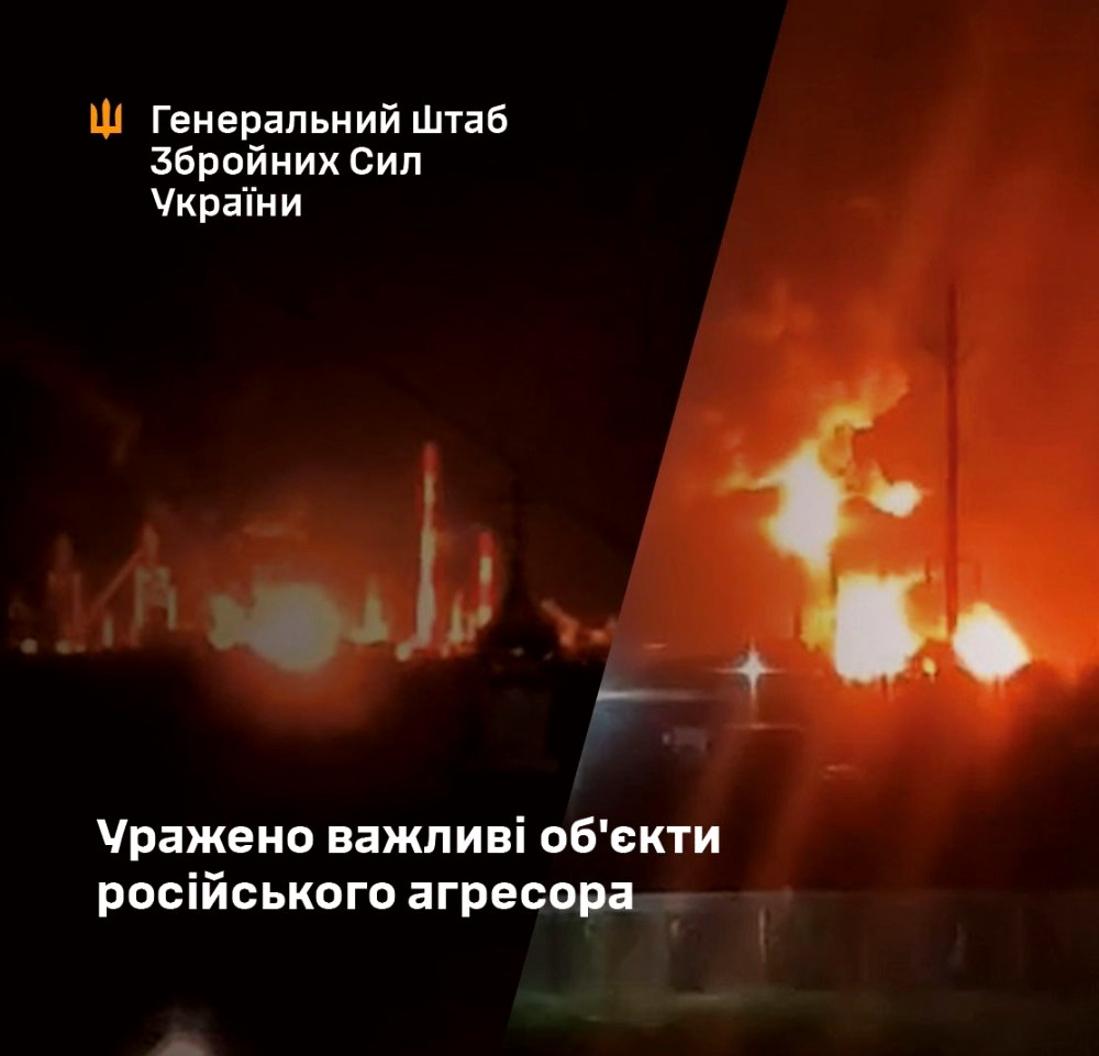 In the night of August 30, to reduce the offensive potential of the enemy and complicate fuel supplies, units of the Drone Forces and Special Operations Forces of the Armed Forces of Ukraine, in coordination with other defense components, targeted the “Krasnodar Oil Refinery” (Krasnodar Krai, Russia). This refinery produces 3 million tons of light petroleum products annually, including gasoline, diesel, and aviation fuel, playing a crucial role in supplying the Russian military. Numerous explosions and a fire at the site have been recorded.