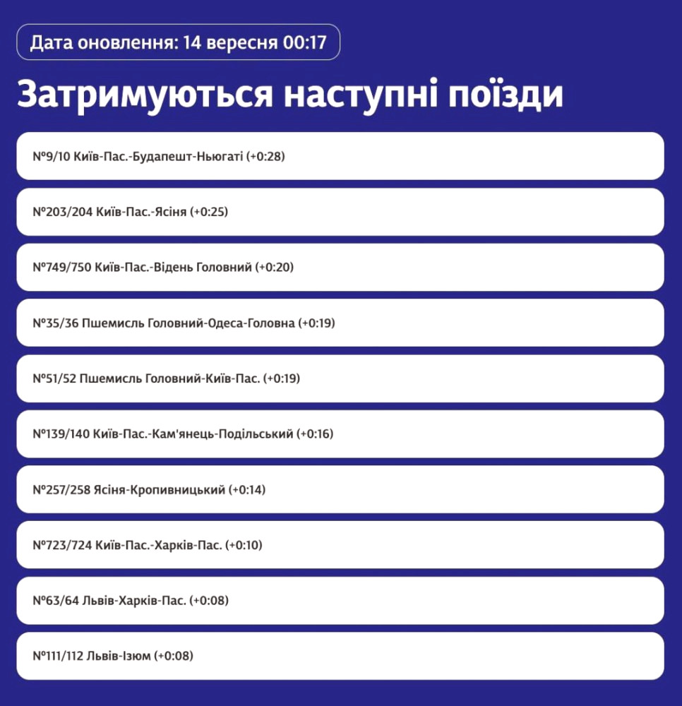 Train No. 139 Kyiv - Kamianets-Podilskyi, No. 141/143 Sumy, Chernihiv - Rakhiv, and No. 21/103 Kramatorsk, Kharkiv - Lviv will also be redirected on altered routes.