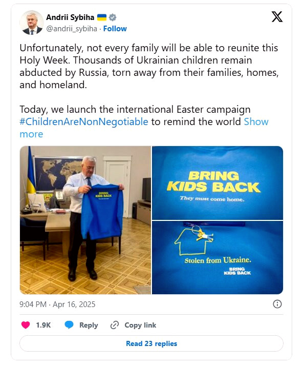 On April 16, Ukrainian Foreign Minister Andriy Sybiha announced the launch of a new international campaign called #ChildrenAreNotNegotiable, aimed at drawing attention to 20,000 Ukrainian children kidnapped or displaced by Russia.