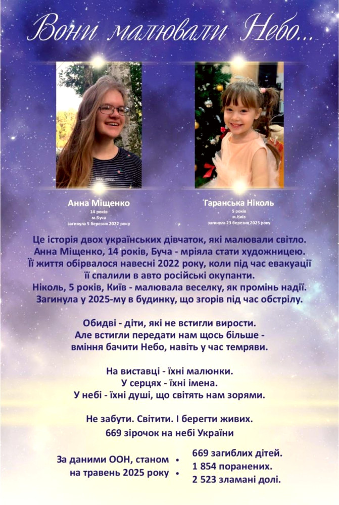 На виставці представлені їхні роботи, які відображають їхню енергію. Це пам'ять про дітей, які стали жертвами війни, та нагадування про мрії, що так і не збулася.