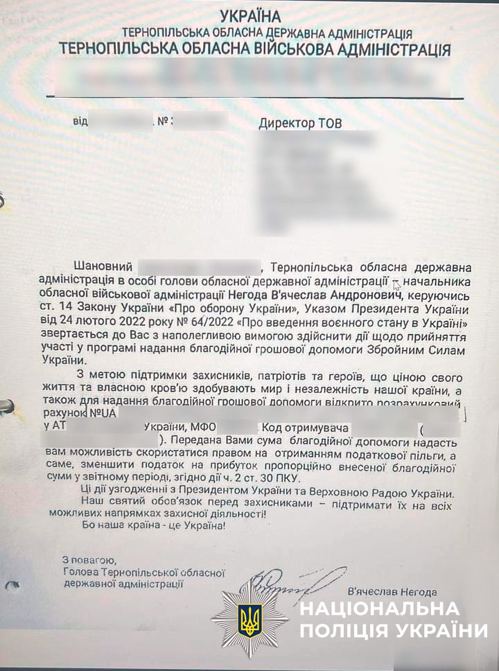 Для підвищення довіри шахраї створили підроблений документ з підписом голови однієї з обласних військових адміністрацій та фальшивий акаунт у Telegram.