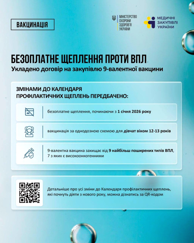 З 2026 року в Україні вперше запровадять безкоштовну вакцинацію дівчат віком 12-13 років проти вірусу папіломи людини (ВПЛ).