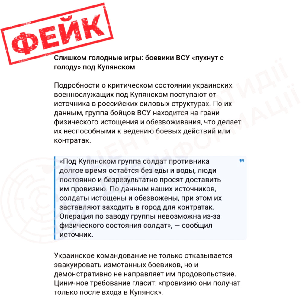 За повідомленням Центру протидії дезінформації, активізуються дезінформаційні кампанії з боку Росії, які намагаються знизити авторитет Збройних сил України. У телеграм-каналі ЦПД зазначено, що російські інформаційні війська поширюють неправдиві відомості про нібито важкі умови для українських військових під Куп'янськом, де вони нібито залишилися без їжі та води й відмовляються від бойових дій.