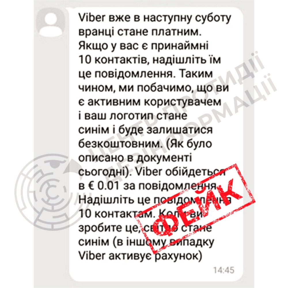 «Користувачі отримують повідомлення, що «вже наступної суботи Viber стане платним». У тексті закликають «переслати це повідомлення 10 контактам, щоб месенджер залишився безкоштовним», і додають, що після цього «логотип стане синім». Це старий фейк, який циркулює у мережі з 2018 року. Його текст неодноразово «оживав» у нових хвилях розсилок. У повідомленні немає жодних конкретних дат, офіційного джерела або підтвердження від компанії Viber. Фрази, як «наступної суботи» без вказування точної дати, використовуються для створення ілюзії актуальності», - йдеться у повідомленні.