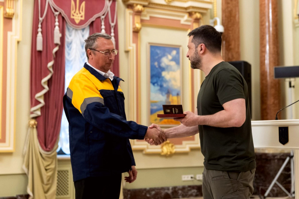 Володимир Зеленський вручив ордени «За мужність» III ступеня родичам машиніста-обхідника Херсонської ТЕЦ Михайла Каретного та слюсаря Євгена Петрика, які отримали нагороди посмертно.