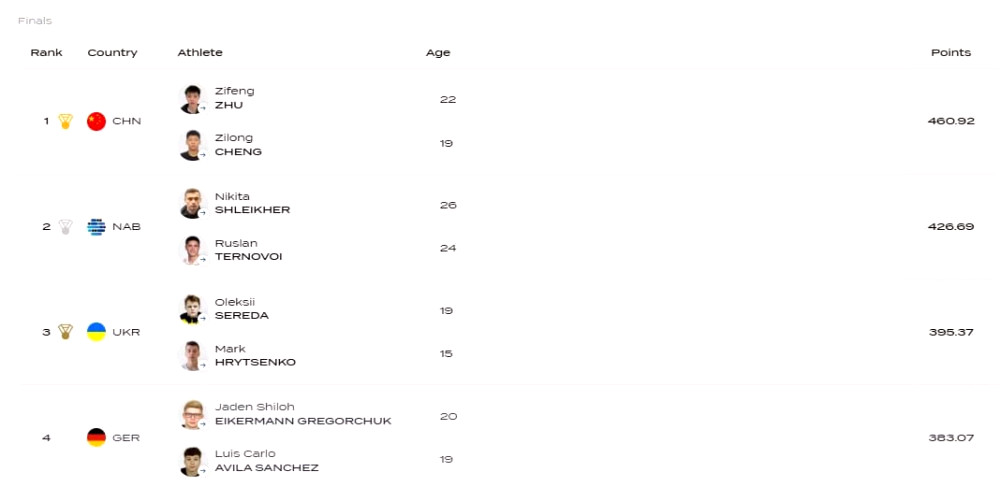 Золота медаль дісталася китайській парі Жіфенг Жу та Жилонг Ченг, а срібло отримали спортсмени, які виступали під нейтральним прапором.