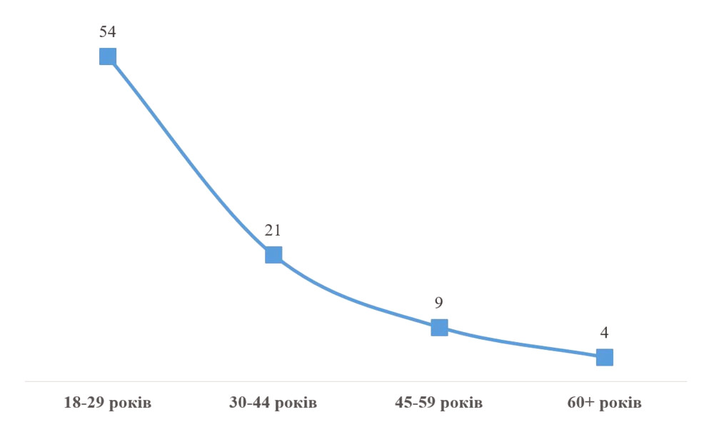 Найчастіше штучний інтелект використовують молоді люди віком від 18 до 29 років, яких 54%. Лише 4% опитаних у віці понад 60 років використовують ШІ.