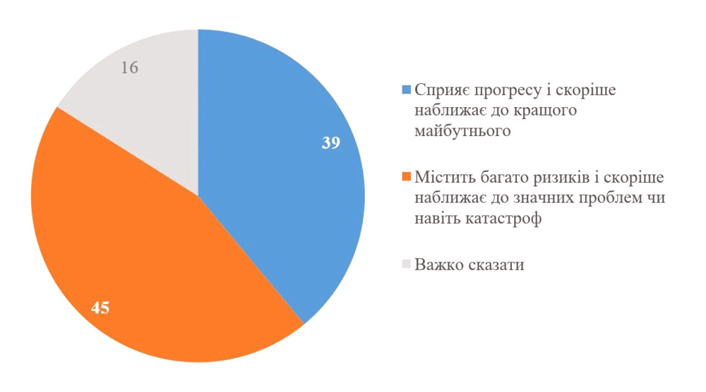 Щодо впливу штучного інтелекту на світ і людей, майже половина опитаних вважає, що ці технології несуть багато ризиків і можуть призвести до серйозних проблем. 39% вважають, що ШІ сприяє прогресу та наближає людство до кращого майбутнього. 16% не змогли визначитися з відповіддю.