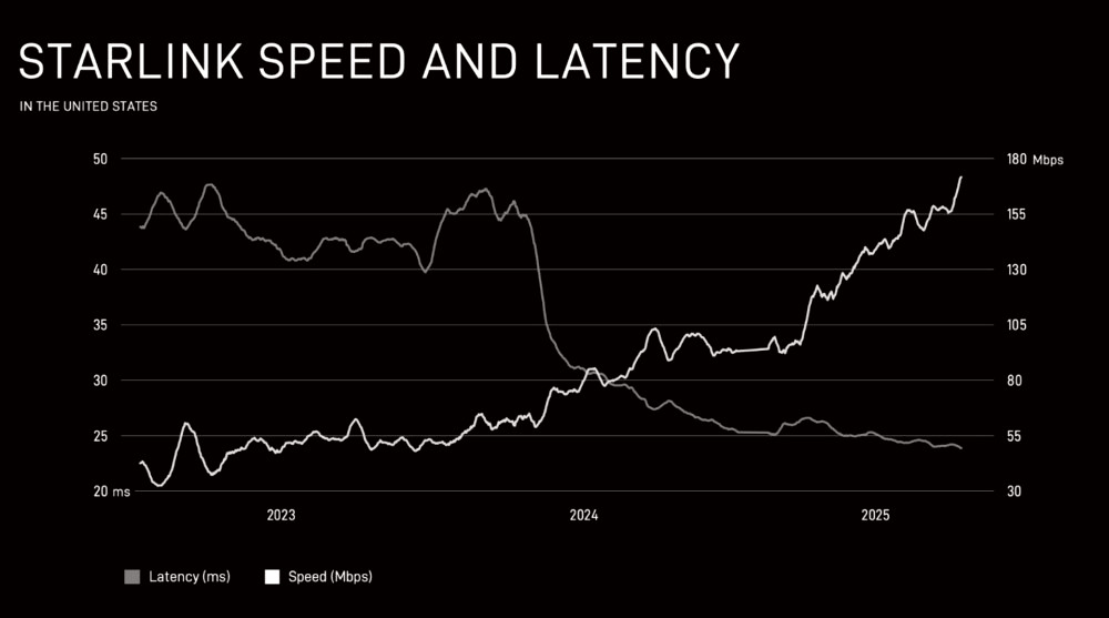 У США середня швидкість завантаження в години пікового навантаження складає 200 Мбіт/с при затримці в 25,7 мс. Менше 1% вимірів перевищують 55 мс. Starlink також має найбільшу наземну інфраструктуру супутникового зв'язку у світі, з понад 1500 антен, розгорнутими по більш ніж 100 об'єктах у США.
