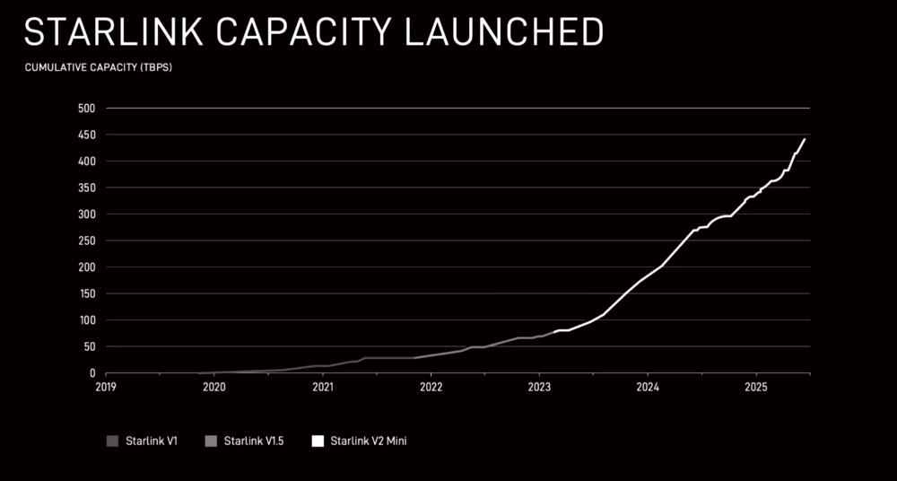На даний момент загальна пропускна здатність всіх активних супутників Starlink становить близько 450 Тбіт/с. За останній рік Starlink додала понад 2300 супутників, розширила покриття на 42 нові країни та збільшила кількість користувачів до більше ніж 6 мільйонів.
