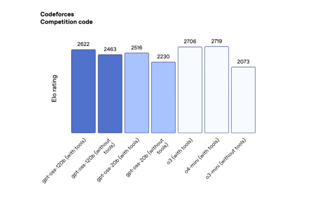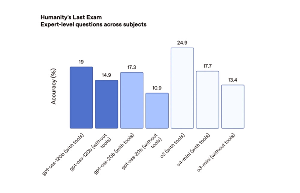 Що стосується тестування, то на платформі Codeforces модель 120b набрала 2622 бали, а 20b — 2516, перевищивши DeepSeek R1, але поступившись закритим моделям o3 та o4-mini. На тестуванні Humanity’s Last Exam (HLE) модель 120b показала результат 19%, а 20b — 17,3%, що є кращим результатом, ніж у інших відкритих моделей, але все ж нижче за o3.