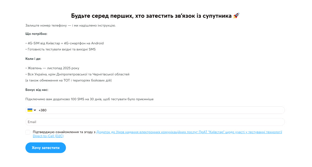 Компанія "Київстар" розпочинає експеримент з впровадження інноваційної технології Direct to Cell для своїх користувачів. На даному етапі планується тестування SMS-сервісів. Участь можуть взяти всі бажаючі.