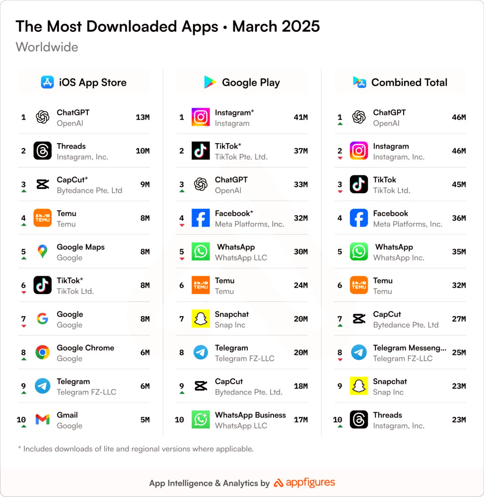 У березні до п'ятірки лідерів завантажень також потрапили соціальні додатки Facebook і WhatsApp, а інші, такі як Temu, CapCut, Telegram, Snapchat і Threads, увійшли до десятки.